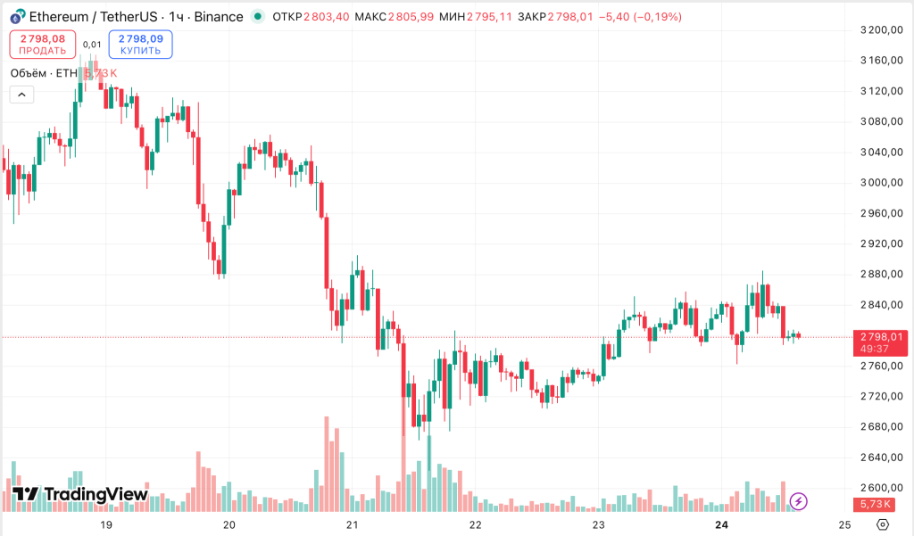 На момент написания Ethereum торгуется около $2800. За неделю котировки актива просели на 12,4%.