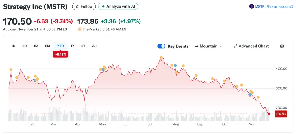 Инвесторы считают, что для казначейской компании устойчивым уровнем mNAV является 2 или выше. С начала года акции Strategy подешевели более чем на 40% — с $379 до текущих $170.