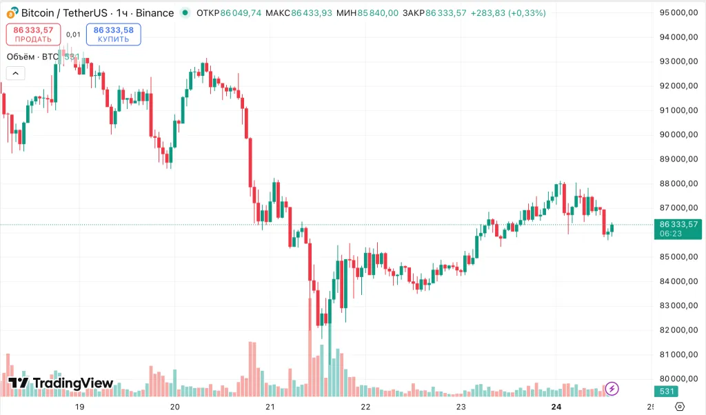 На момент написания первая криптовалюта торгуется по ~$86 300, подешевев на 9,9% за неделю.