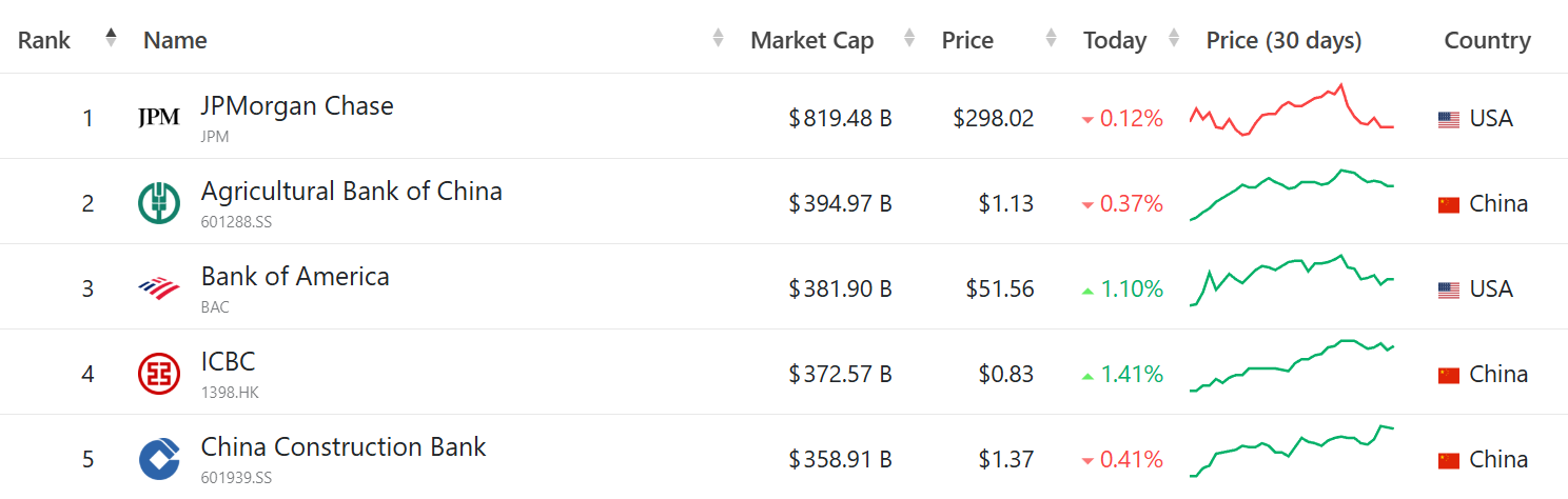 JPMorgan в топ-5 крупнеыщих банков по рыночной капитализации. Источник: companiesmarketcap