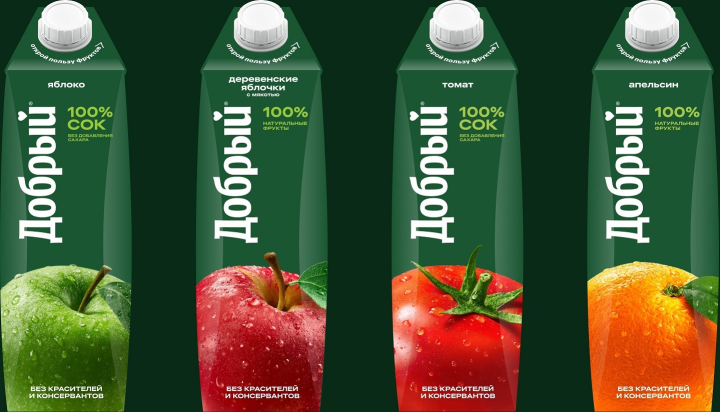 Фото: https://www.artlebedev.ru Бренд соков «Добрый», принадлежащий компании «Мултон Партнерс» (ранее Coca-Cola HBC), обновил дизайн упаковки. Логотип бренда на литровых упаковках теперь располагается вертикально.Цветовая гамма упаковки соответствует существующей палитре бренда «Добрый». Ключевым элементом визуального решения стала реалистичная композиция из фруктов и ягод. Преимущества продукта в клеймах теперь акцентируются на числовых показателях.