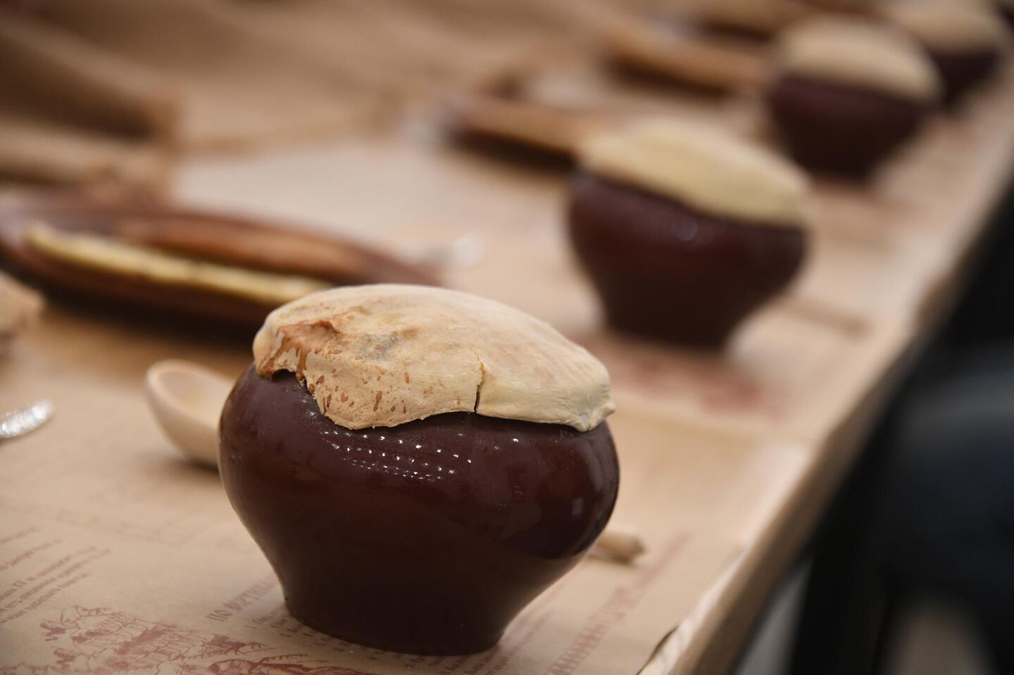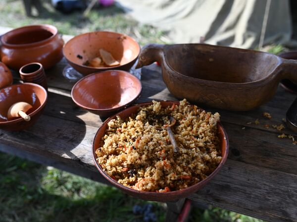 Обед на Куликовом поле© РИА Новости / Кирилл Зыков1. Кундюмы с грибами и сарацинским пшеном (рисом), запеченные в русской печи© РИА Новости / Кирилл Каллиников 2.